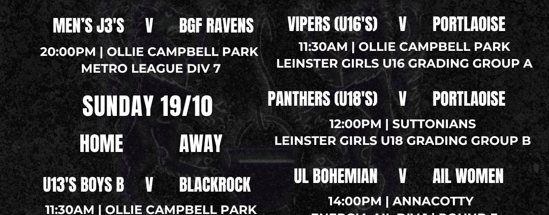 Saturday, our AIL Women travel to Limerick to face UL Bohemian in Round 3. We also have a packed day at home, with our Youth Girls Sharks (U14’s) and Vipers (U16’s) both in grading action. Panthers (U18’s) play Portlaoise in Suttonians. On Sunday, our U13 Boys are in grading matches, and our Men’s J2s return to home soil to take on Terenure in the Metro League.