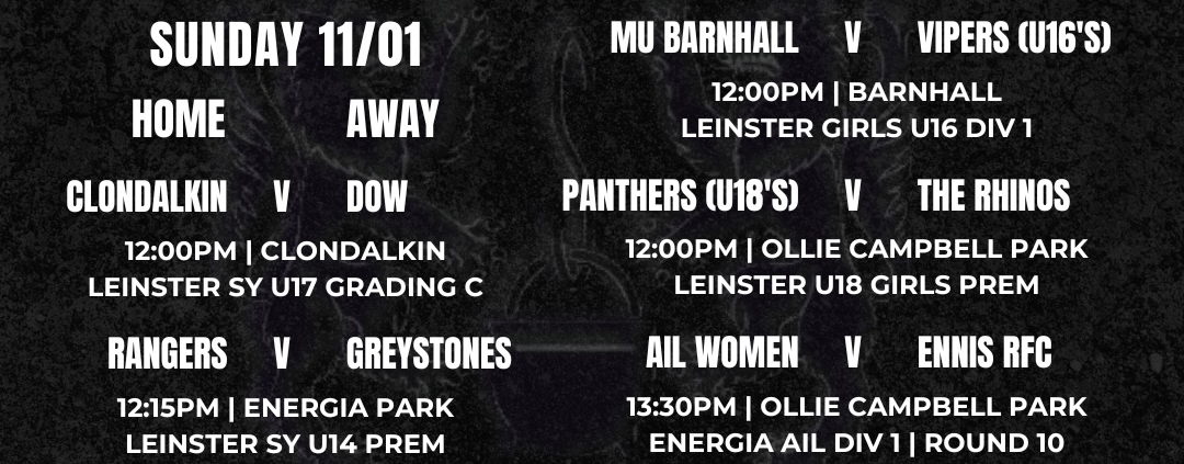 Saturday sees our AIL Women welcome Ennis RFC for AIL Round 10. This will be the first home meeting after an exciting draw between the sides in the final game before Christmas. The Panthers (U18s) also host The Rhinos in Leinster Premier action, while the AIL Men travel to Lakelands to take on Terenure. Our Men’s J3s round out the home action at OCP against Guinness in the Metro League.