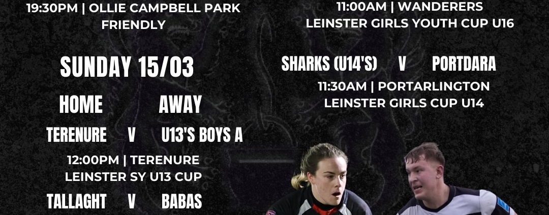 11:30 – Sharks U14’s v PortDara, Portarlington – Leinster Girls Cup U14